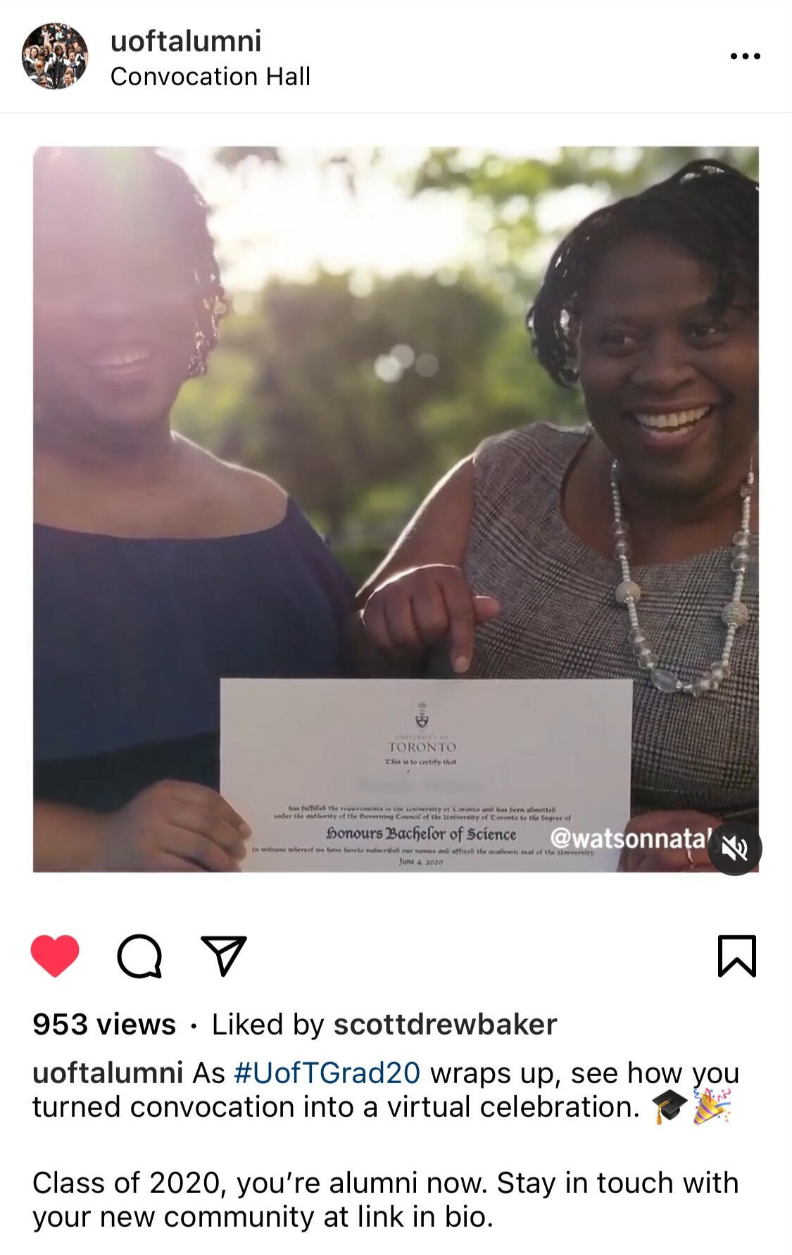 I have worked on the Convocation portfolio since 2018, where I developed social media strategies and schedules for both in-person and virtual ceremonies. I led the development of multiple video projects, consulted on the creative approach and utilized user-generated content to welcome the newest grads to the community.